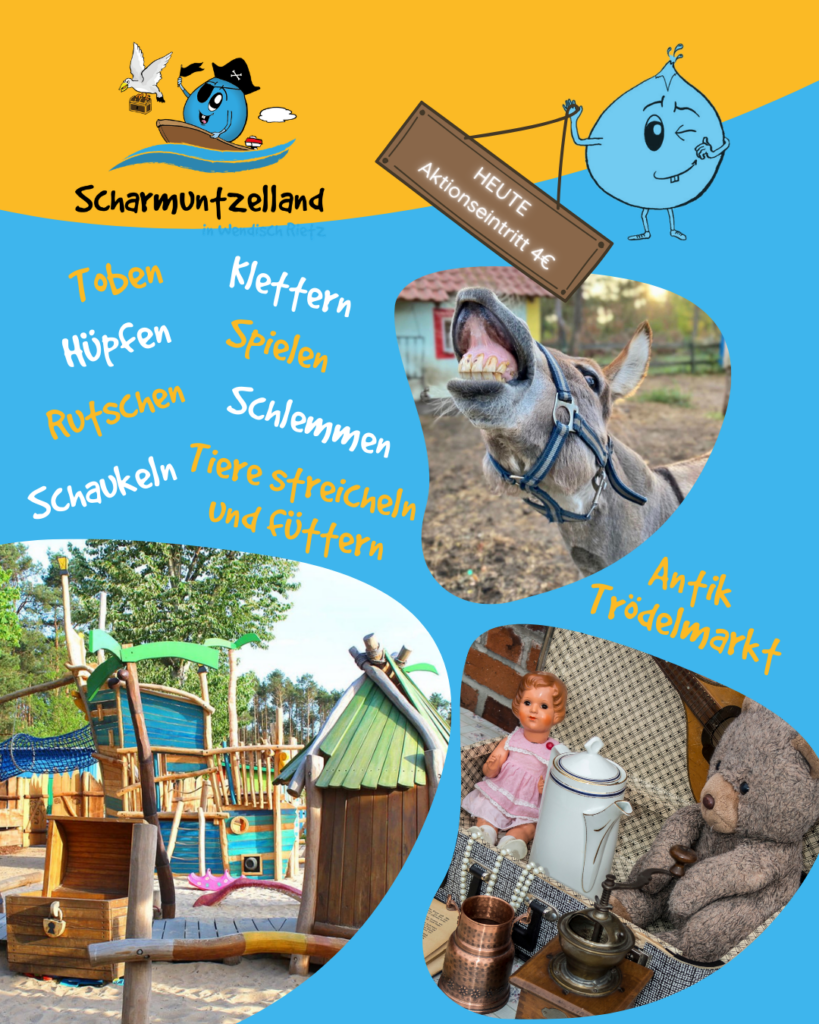 Erst gemütlich über den Trödelmarkt schlendern, dann im Scharmuntzelland toben, klettern, hüpfen, Tiere streicheln und füttern! 🐐🎈🤸♀️+++Für nur 4 € – Aktionseintritt.+++